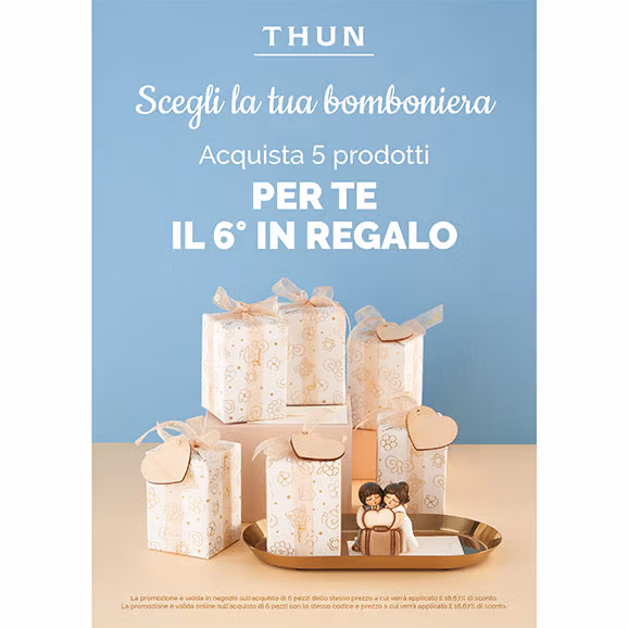 Scegli le tue bomboniere e rendi ancora più unica la tua cerimonia. Scopri tutte le nostre idee bomboniere per rendere speciale ogni tua occasione. Acquista 5 pezzi dello stesso prodotto e 1 te lo regaliamo noi*. Bomboniere Matrimonio L'inizio del vostro stupendo viaggio insieme Cerimonie Bambini Tante nuove tappe da celebrare, per crescere insieme Bomboniere Laurea e momenti speciali La gioia di traguardi importanti Bomboniere funzionali Piccoli attimi di felicità, da rivivere ogni giorno * La promozione è valida in negozio su 6 prodotti dello stesso prezzo, applicando il 16,67% di sconto sul valore totale. La promozione è valida online su 6 prodotti dello stesso prezzo e dello stesso codice, applicando il 16,67% di sconto sul valore totale. Condizioni e durata dell’offerta disponibili presso i punti vendita aderenti all’iniziativa.
